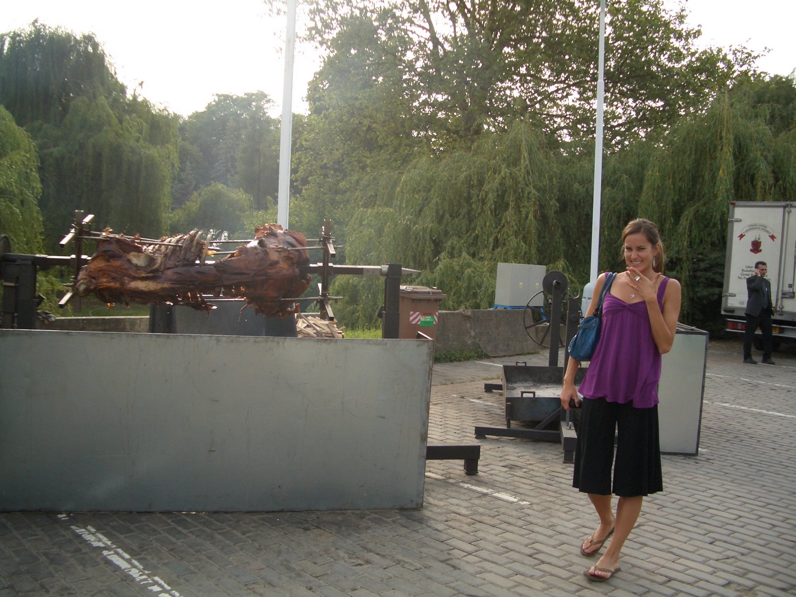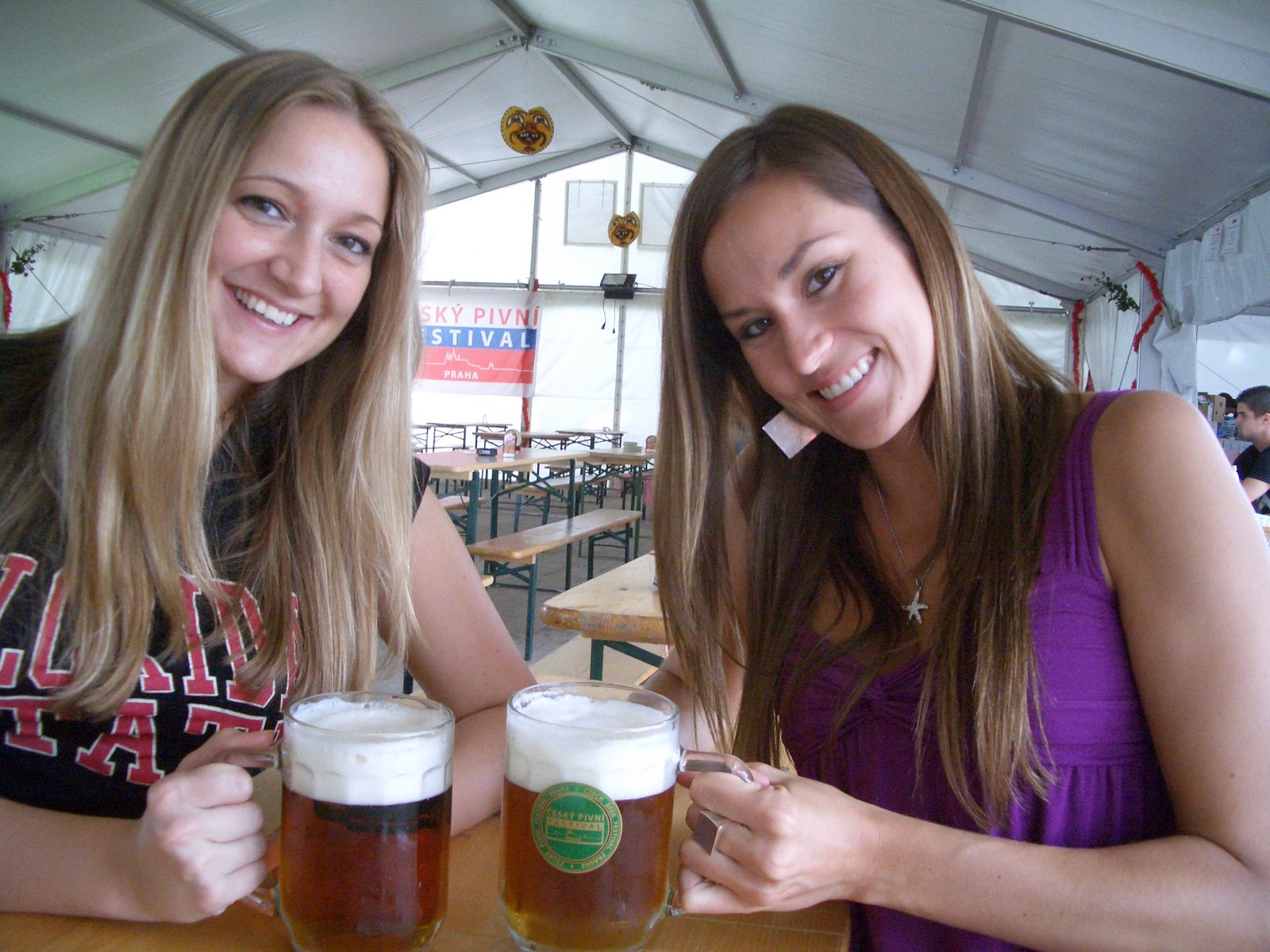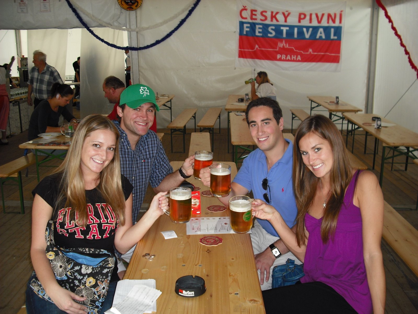 Friday, Meryl, Harris, Kyle and I went to Beerfest straight from class. It was absolutely fantastic. When you first walked in, it looked like there was nothing there and it looked like an abandoned ghost town, but after we got in there, there were like 20 tents, each with different kinds of beer and food. All the workers were dressed up in what I guess in traditional attire, but it looked more like what I would think they would wear in a place like Sweden. There was live music and girls dancing and singing. It actually kind of reminded me of the German beer house at Busch Gardens. Each beer was a half a liter, so we only tried 4 or 5 before we were really sloshed. Meryl and I also tried some Moravian wine, which I was so excited to learn came in the form of a keg! I cannot believe that we don’t have that in the US. A wine keg would be so essential at law school socials!
