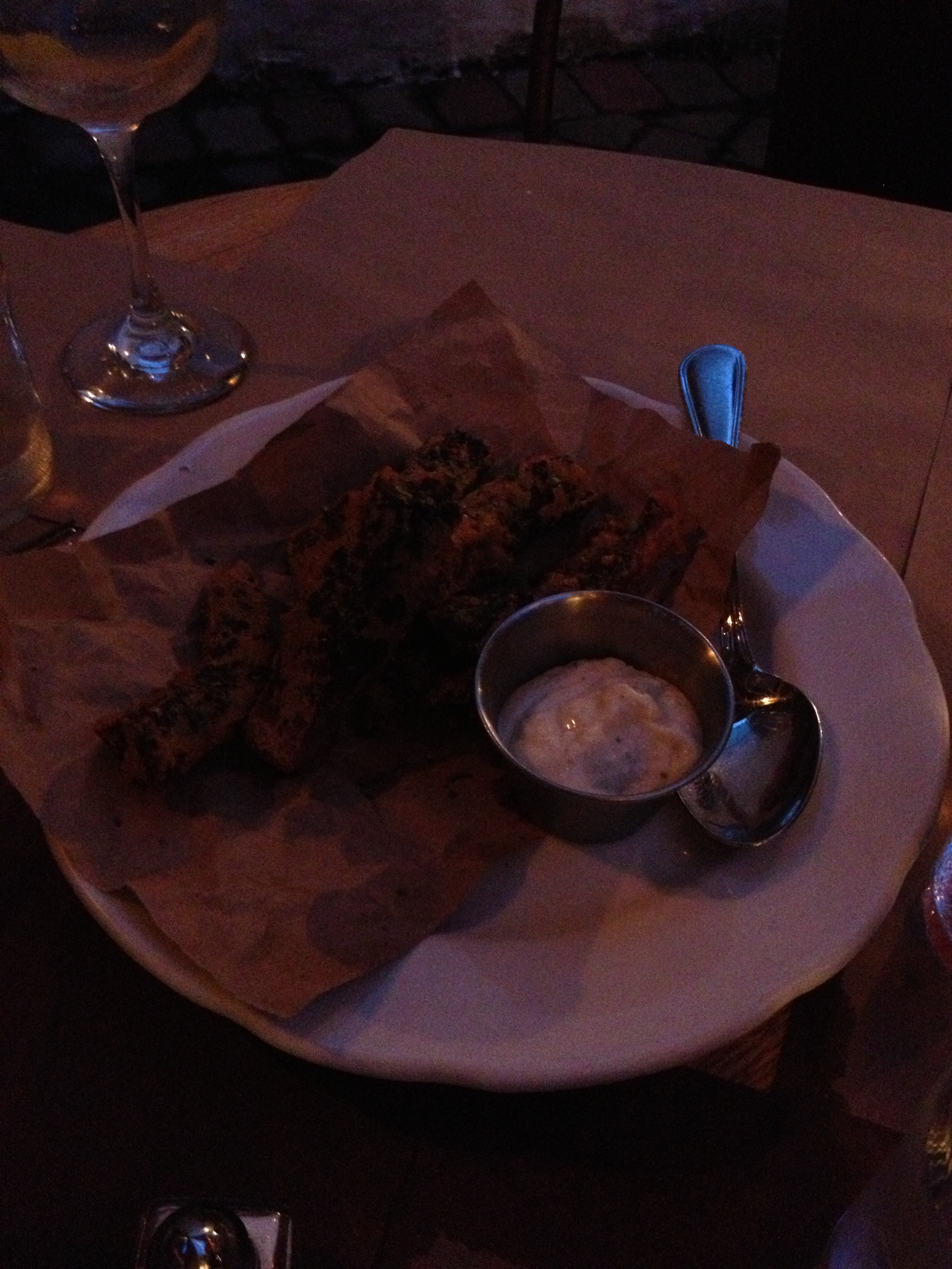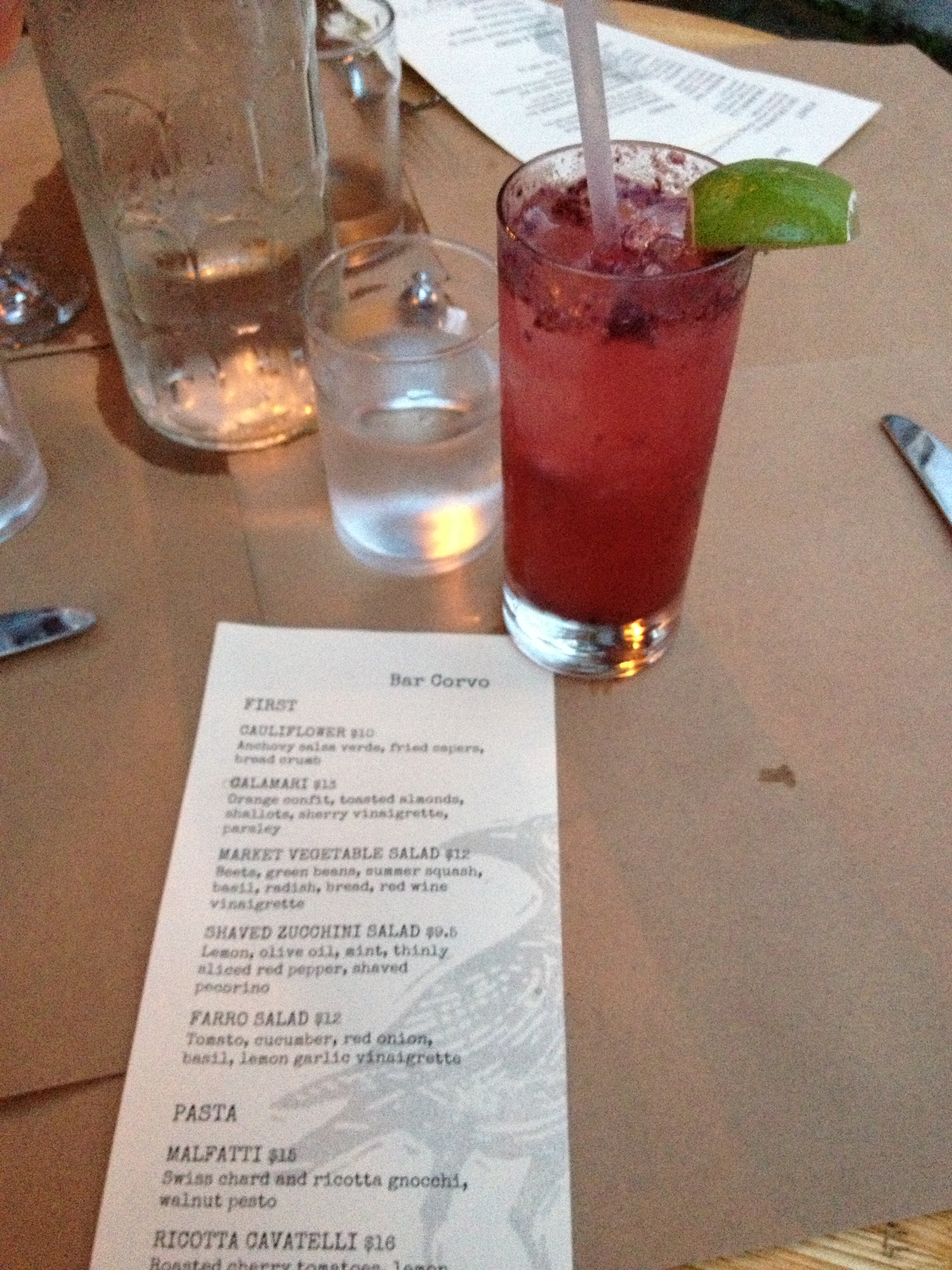 Bar Corvo: Our first night in Brooklyn, we ate at Bar Corvo. I loved the “hole in the wall” feel immediately. The dark ambiance and vintage touches felt warm and inviting, like going to a friend’s dinner party. The weather was amazing so we sat on the patio under cafe lights. We ordered beef tongue as an appetizer, which was delicious, and I had a homemade malfatti gnocchi made with swiss chard and ricotta with a walnut pesto for my main. My only complaint would be that the dish had only 5 gnocchi, which I felt was not at all enough. I realize it is NYC and prices are higher and portions are smaller, but it felt like too little for my taste. The cocktails were artisinal and fresh, which as I came to learn, is now the norm at almost every restaurant we ate at. They were great at Bar Corvo, but the winning feature, to me, was the ambience and decor.