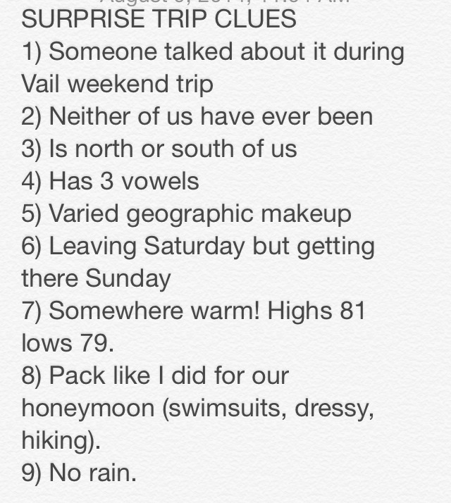 Alex started planning this surprise trip about eight months ago. I knew we were going on a trip and was told to request the days off from my job, but I had absolutely no idea where we were going. Throughout the last eight months, Alex has occasionally given me a clue as to our surprise trip destination, but I honestly had no idea what to expect. Sometimes the clues came months apart and if I had a guess about where we were going, I was usually thrown off my path by the next clue. For curious minds, here are the clues Alex gave me: