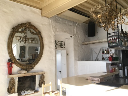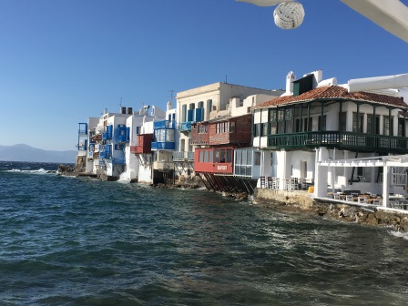 To end our visit in Mykonos, we had cocktails at Galleraki, a fun bar with a young and fashionable crowd. Galleraki has a great menu of juices, alcoholic beverages, and snacks. You can sit on the deck next to the water, but warning: it’s a splash zone! The best place to sit is on the deck where you can enjoy the beautiful views without being soaked.