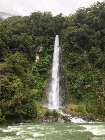 Unfortunately, the skies opened up just as we were finishing the Franz Josef Glacier hike, so we weren’t able to do the Lake Matheson hike, which is said to have a beautiful reflection of Mts. Cook and Tasman in the lake on a clear day. We had dinner at the restaurant at our hotel, the Heartland World Heritage Hotel Haast in Haast. It’s not our usual preference to eat at a hotel, but it was literally the first restaurant we saw and it turned out to be quite good!
