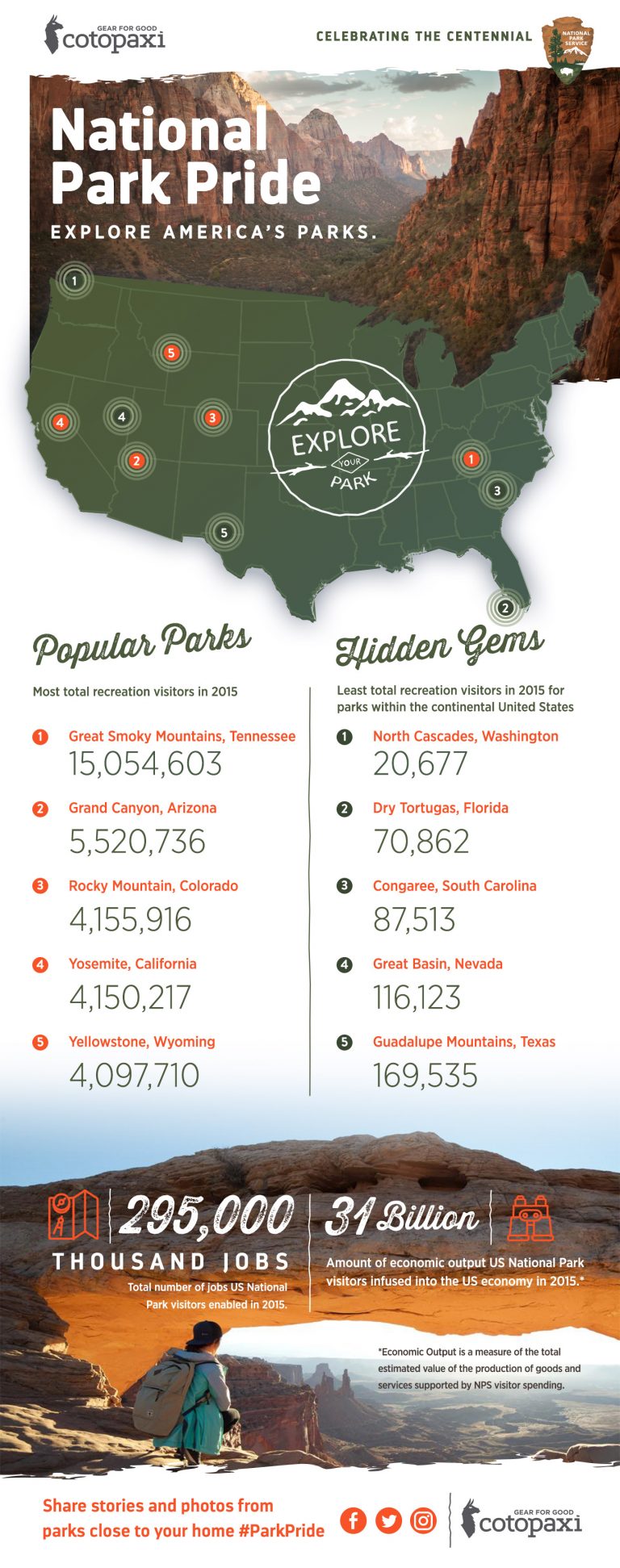 With that, I wanted to share a cool infographic from Cotopaxi, a hiking gear and backpack company that donates a percentage of every sale to various organizations that support worldwide health initiatives. The company was founded on the principals of making a difference and inspiring people to get outside, be active, have adventures, and spread good vibes. The infographic shows the most and least popular (by number of visitors) national parks in the country which should give you some inspiration to plan your next national park visit. It also breaks down how your visit to a national park can help the United States economy. I think we can all agree that feeling like you are doing your part to help better our country is always a good feeling!