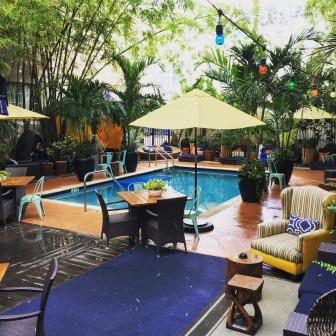 When we arrived at Miami International Airport, we caught the Riviera South Beach‘s free shuttle and took it to the hotel to check in. We adored the hotel and will definitely return on a future visit. Although Miami Beach is known for some of the larger luxury hotel brands, several boutique hotels have been popping up in recent years that offer similar service and amenities at a fraction of the price. During our stay, Riviera Hotel provided great service, clean rooms, and beautiful decor. The location can’t be beat – it is within walking distance of many of the hottest spots in the area. The beach is only a few blocks away and the hotel is located across the street from a fantastic craft cocktail bar and restaurant, Sweet Liberty (more on that later). Two pools are available at the hotel – one rooftop and one shadier option that feels as if it’s in a jungle oasis (see photo below).