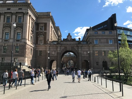 After a very good night’s sleep and a delicious breakfast at the Clarion, we walked to Old Town for the 10 am free walking City Tour. You might recall that we are very big fans of the free walking tour concept (we’ve done them in Sydney, Melbourne, Paris, Athens, Istanbul, and Auckland). We had great experiences in all of those cities and there were never more than 15-20 people on the tours. However, the Stockholm tour was enormous. There were easily 50 people. I’m not sure if free walking tours are growing in popularity everywhere or if it’s busier in Stockholm, but we almost left when we saw the group size (which, I might add, seemed to grow throughout the tour). I am very much not into walking around cities as part of a large group of tourists. Not only is it harder to hear the guide, but I also feel unsafe given the current climate. I hope our days of free walking tours are not over, but I don’t think we’d do another in such a large group. With that said, the guide of the tour was very informative and engaging and we learned a lot about Stockholm. If the group size doesn’t bother you, definitely do it!