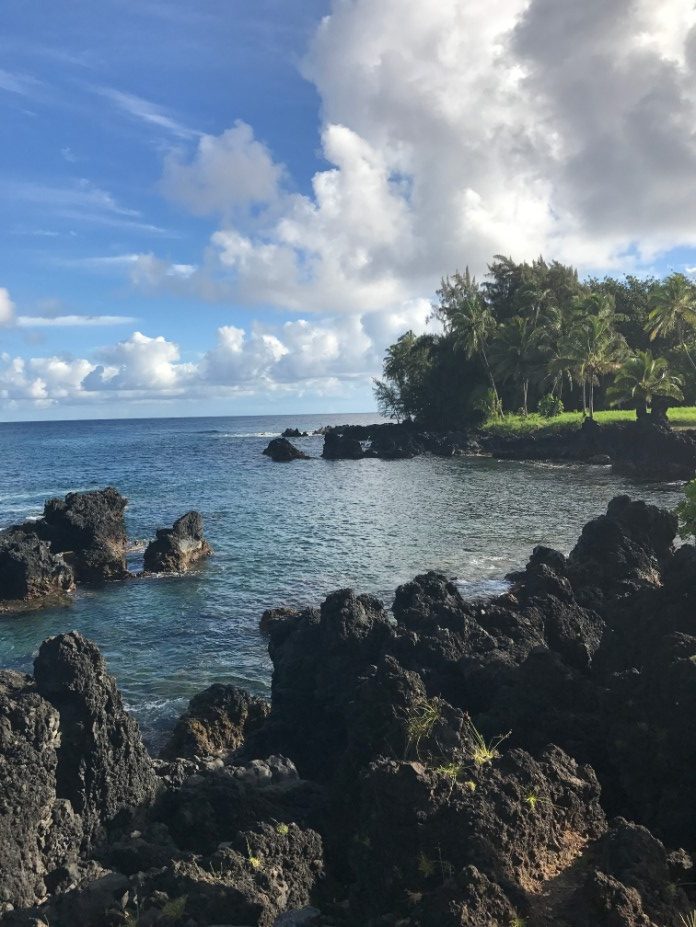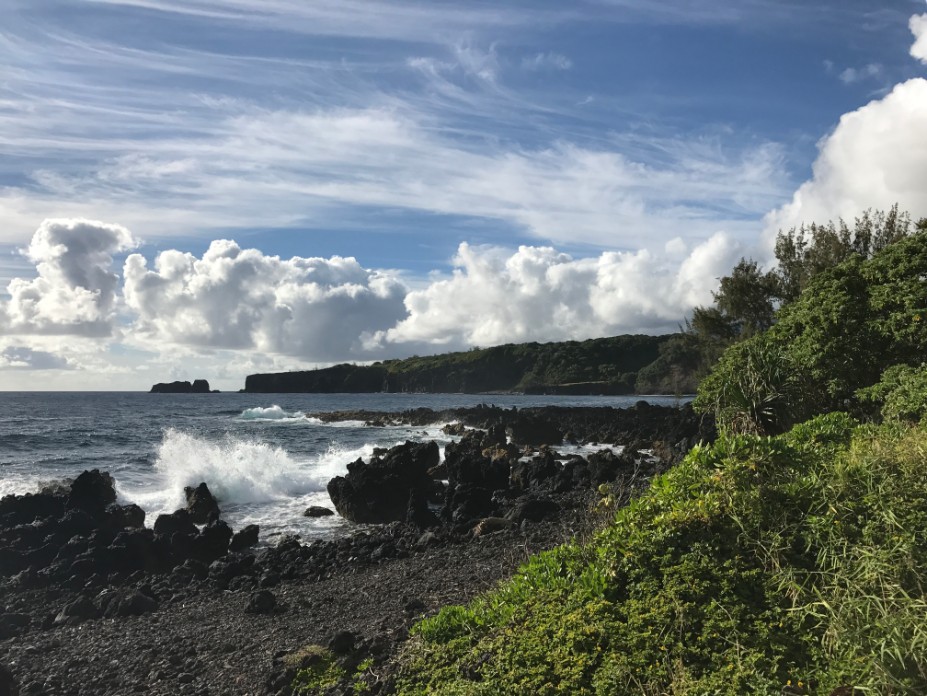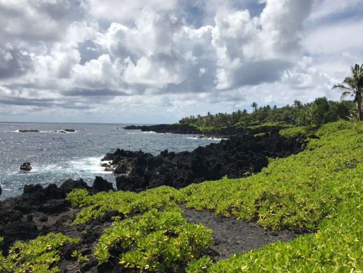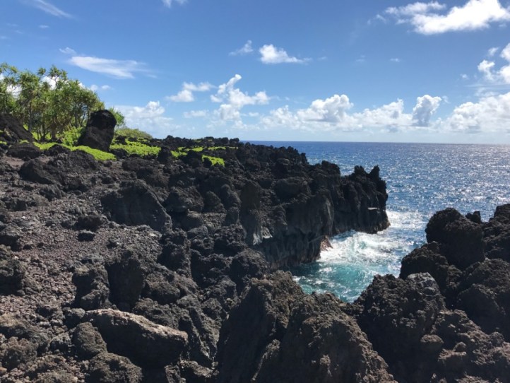 MM 16.8 Ke’ane Peninsula. Stop for epic views of along the ocean cliffs made of black lava rock. Aunt Sandy’s snack stand is allegedly the best for banana bread and also sells shaved ice and smoothies. Unfortunately, it was closed on Sunday, the day we were driving the Road to Hana.