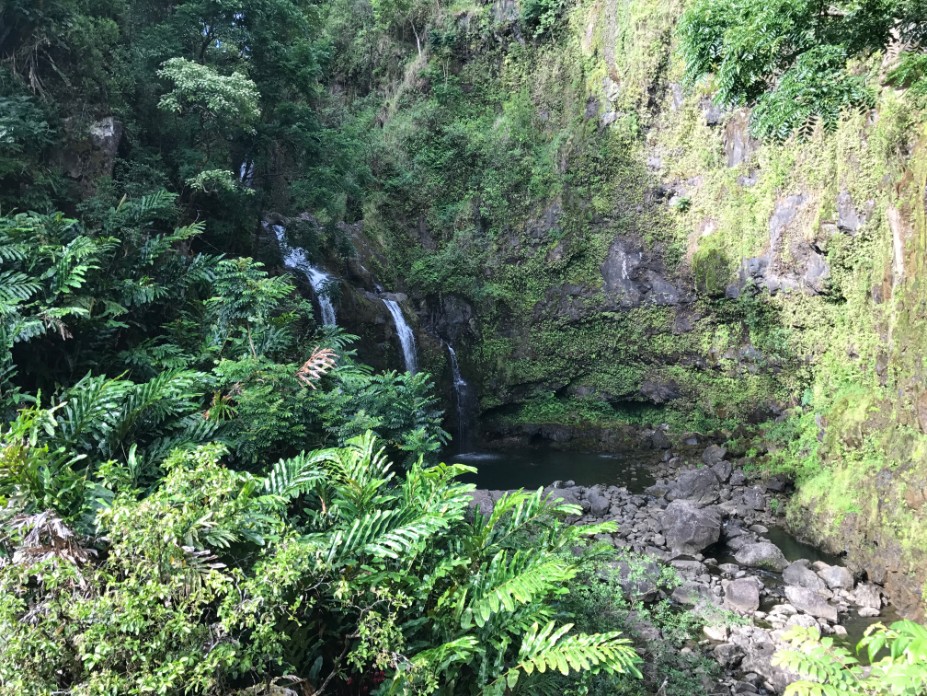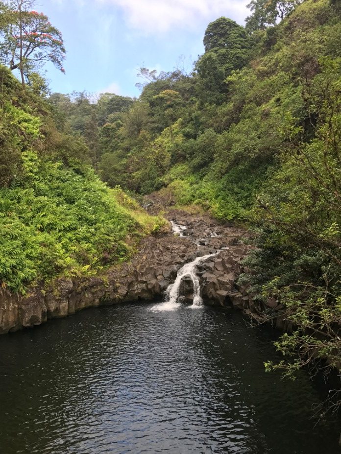 MM 19: Upper Waikani Falls/3 Bears Falls. Unfortunately the falls were dry when we traveled the Road to Hana, but during the wetter season, this is supposedly a great stop. The falls are visible from the road, but you can also park and take a short walk down to a swimming area. It’s not recommended to jump into this pool however, as it is quite rocky.