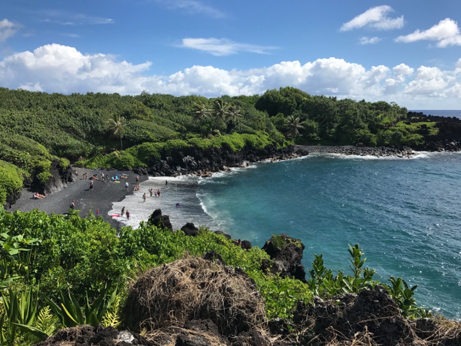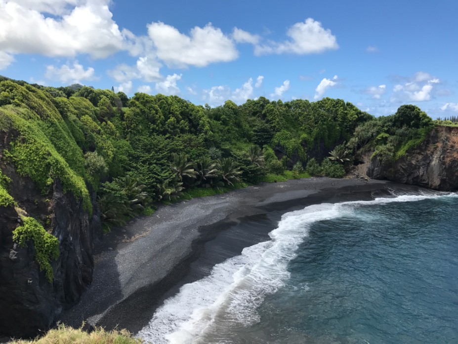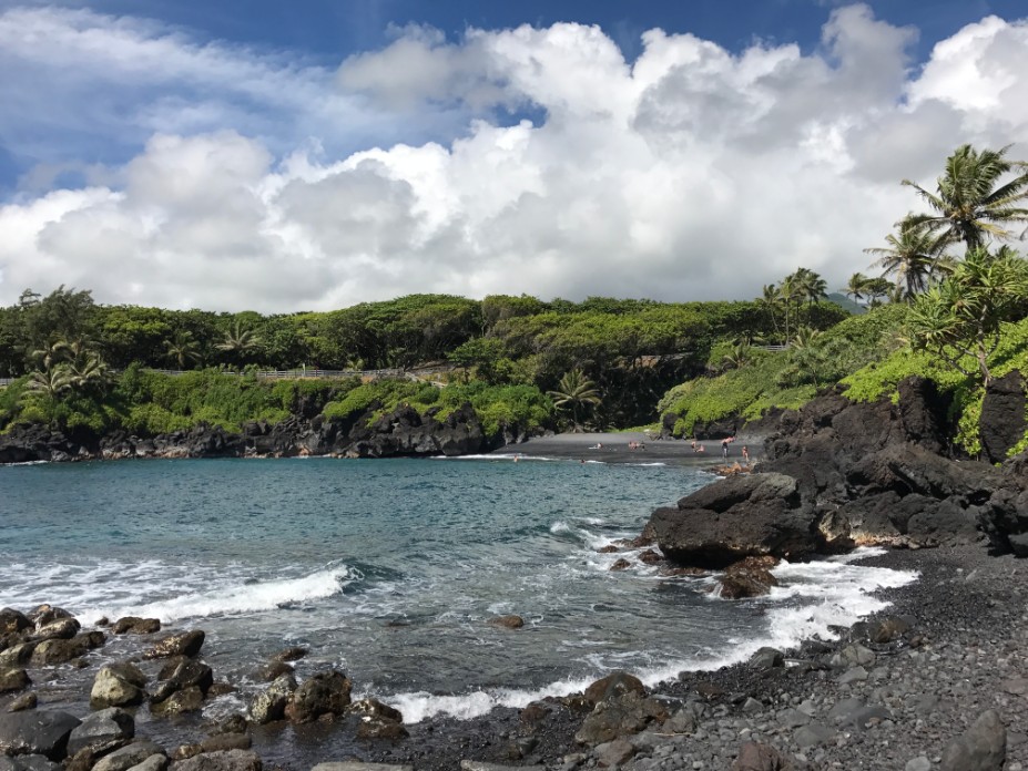 MM 48.1 – Venus Pool. This is another somewhat hidden spot that locals love. You’ll park near the Hana Ranch and enter a fenced area. You’ll probably see other people going in so just follow someone if you’re not sure where to go. If you take the path to the right, you’ll find Waioka Pond or Venus Pool, where you can do some cliff jumping and swimming. If you take the path to the left, you’ll reach the Hidden Black Sand Beach. According to Roamaholic, there’s actually a way to climb down to the beach that requires a steep descent by rope. We skipped that, content with some photos from above.