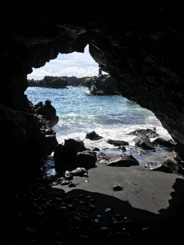 MM 32.2 – Wainapanapa State Park. Now you’ve reached the best part of the Road to Hana (in my opinion). We recommend brief stops at basically everything up to this point because you’ll want to spend plenty of time at the state park. It is said that the 120-acre park gets very crowded later in the day, which is another reason to arrive early for a more peaceful experience. When you get into the park, you can hike on a few short trails, explore two freshwater caves (or lava tubes), hang out on the black sand beach, and see a natural lava arch and a blowhole. The tide was too low for us to see water bursting from the blowhole, but you might get lucky!