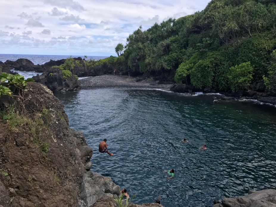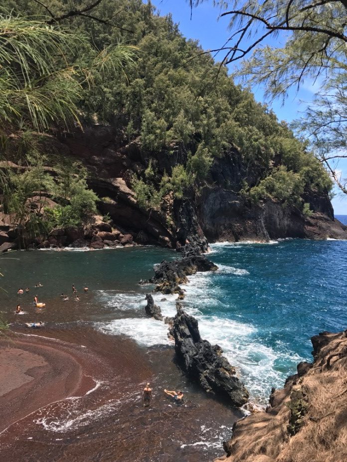 MM 34: Kaihalulu Red Sand Beach. One of our favorite stops of the day was the hidden red sand beach in Hana. Follow the directions on Roamaholic and cross the grassy field on the side of the Hana Community Center where you’ll see a path entering the woods. Be careful – the trail can be a bit slippery. It’s totally worth the short hike to find this hidden sand beach where you can swim in an ocean pool and jump off rocks. It’s not completely unknown, so you’ll see other people there, but it’s is definitely more off the beaten path!