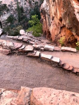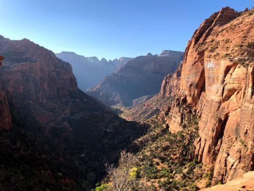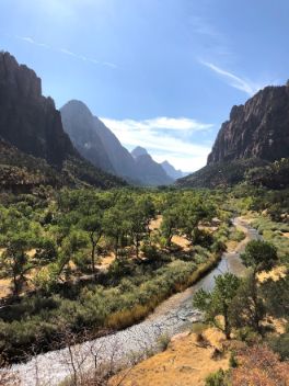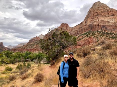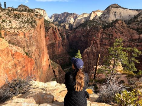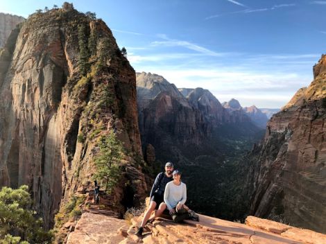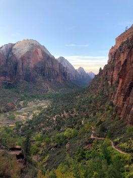 Our first full day in Zion, we did the infamous Angels Landing hike (5.4 miles round-trip). I wanted to have fresh legs since I knew it was a tough one. We were on the first shuttle so it was nice that we weren’t passing anyone coming down along the hike. The first half mile or so is flat, but the rest of the hike is a constant climb until you reach the chains portion. It took us about an hour to reach the chains, including time to stop and take photos. There is a bathroom and water available here. Luckily the chains had opened a couple of days before our visit (they had been closed due to COVID previously). As many have pointed out, the chains section is pretty scary and definitely not the best if you are afraid of hikes. To be honest, I didn’t make it the entire way. I made it maybe halfway to a really fantastic lookout point and then decided that was enough for me. There are a lot of people so you have to go one by one and it’s a very sheer drop. I can’t even imagine what it’s like when it’s even busier.