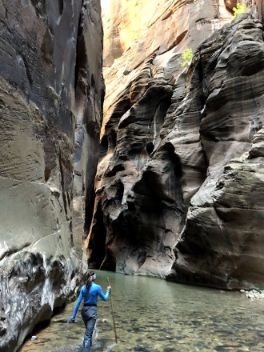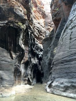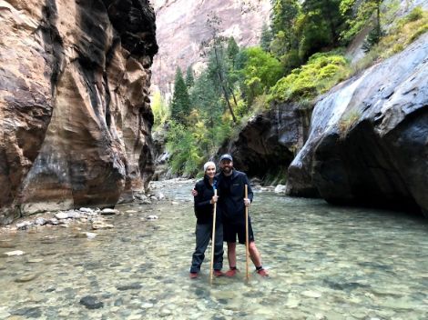 On our second full day, we did the Narrows hike. The night before, we picked up gear for the hike at Zion Outfitter, located just outside the park visitor center. It’s $25 for the day for the socks/shoes and $41 for the socks/shoes and dry pants – both include a walking stick. Depending on what time of year you’re going, you’ll definitely want to get the gear for this hike to stay dry and warm! I would recommend getting the dry socks/shoes no matter what time of year you’re going, to stay dry and avoid blisters from wet socks and shoes. The Narrows hike is one of the best hikes I’ve ever done. It is so unique to hike literally through a river in a canyon. I had actually thought about not doing the hike because I didn’t find the idea of being cold and wet that appealing, but I can’t believe I ever thought that after doing it. After the trip, I would say this hike cannot be missed. It’s not particularly hard as it’s flat the whole way, but it is still somewhat tiring because you’re walking on a riverbed the entire way. You can make the hike as long as you want – we hiked into the canyon 3 miles before we turned around. Our turnaround point was past Wall Street at a big boulder where the river gets very deep. It took us about 4 or 5 hours, including stopping for lunch in the canyon. This hike also gets very crowded the later you go, so we definitely recommend an early shuttle. The downside to going early and missing the crowds is that the lighting isn’t great for photographs early in the morning.