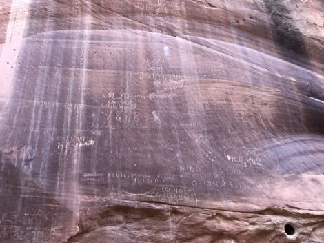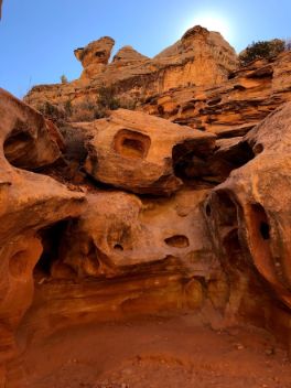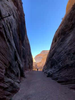 We started out with a hike through Capitol Gorge, where you can see the pioneer register and petroglyphs of people who traveled through the gorge. It was neat, but it’s completely shaded by the canyon walls and it was a very cold morning. Next, we hiked to Cassidy Arch, which was our favorite hike of the day. It has beautiful views of the park, which we enjoyed while we ate our lunch and watched people repel from the arch before hiking back down. We also did a short hike through the Grand Wash up to the Narrows (not quite as impressive as the Narrows in Zion, but still worthwhile). After our hikes, we stopped at the Gifford House for a second time for peach pie and ice cream, which we enjoyed with a bottle of wine before heading to our next destination.