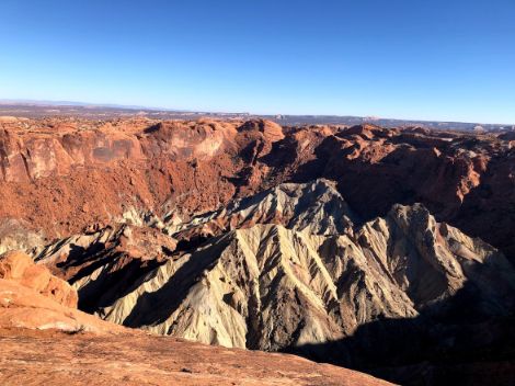 Canyonlands NP is huge – there are three areas of the park so you could easily spend several days here. The views are unbelievable and it was probably one of the least crowded parks, so we really enjoyed that aspect. In the morning, we packed up and made the short drive to Canyonlands NP. We started with a hike to Upheaval Dome (1 mile round-trip) to see a crater.