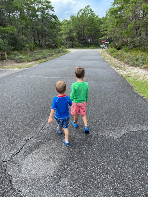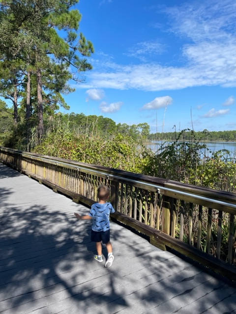 On the other hand, Camp Helen State Park was fantastic! My parents joined my kids and me, and we all had a wonderful time. We hiked the North Trail, which starts from the parking lot and is paved for the first 0.4 miles as you walk along Lake Powell, the largest of the coastal dune lakes in the region. As you continue on, the paved area ends and it becomes a one-mile dirt trail with a self-guided tour of native plants. We loved this portion of the trail because it was numbered with twelve markers, which coincided with descriptions you can find a brochure available at the start of the loop (or at the Visitor Center). This was such a fun scavenger hunt experience for my two and four year old. They loved searching for each number and when we arrived, I’d read about the plant described and we all learned something! Among others, we learned about prickly pear, muscadine grapes, false rosemary, and saw palmetto plants.