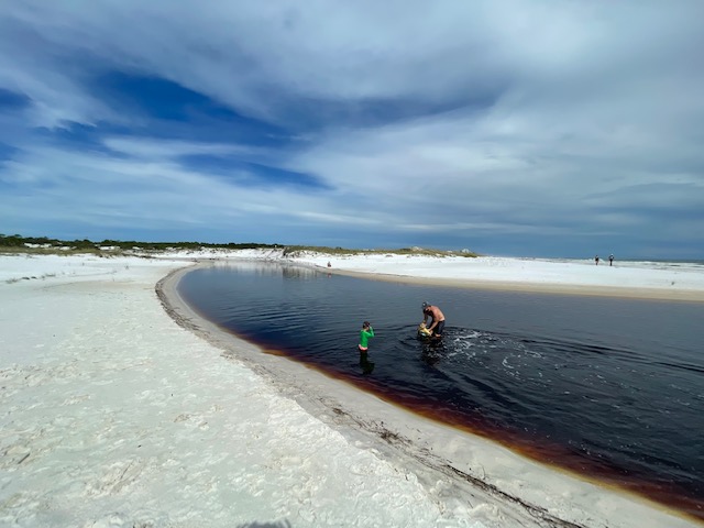 During the days, we typically spent the morning at the beach, where we swam and played in the sand. We were not deterred by the periodic rain during our visit, or the jellyfish that cleared away later in the week after the rain stopped. However, the beach actually had a caution flag several days, which might be the first time I’ve ever seen that on the Gulf Coast! One day, when the ocean was particularly choppy, we swam in a coastal dune lake instead! It was a short walk down the beach just outside the park boundary to the east.