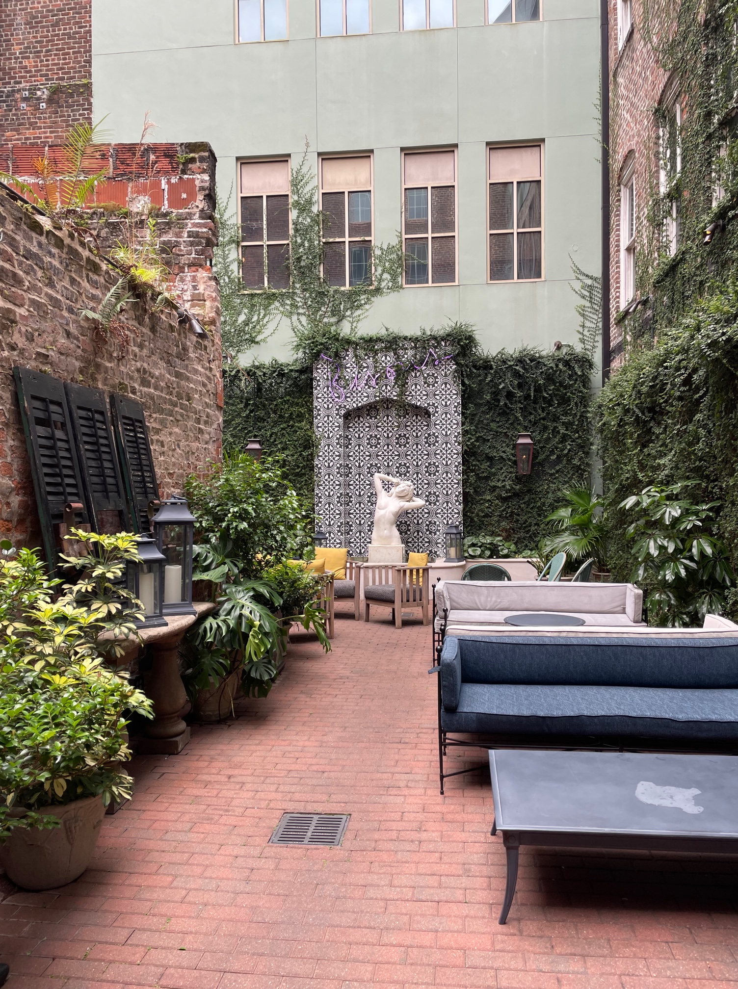 Our home base during our stay was The Eliza Jane, a luxury Hyatt property just outside the French Quarter on Magazine Street. It’s in an excellent location – close enough to walk to the water and French Quarter and only a block or two from the closest St. Charles Streetcar stop (passes are only $3 for 24 hours!), but quiet enough to feel like an oasis. The building was transformed from a 19th century printing house to a stylish boutique hotel designed by Stonehill Taylor, with high-end services and amenities. One of my favorite spots was the courtyard – an open-air oasis in the interior of the building with ample seating, original features, and unique art. I also enjoyed the fitness center, where I did a Peleton ride and strength routine, while it rained one afternoon. The rooms have a modern and eclectic design – our king room had a separate living area with seating and an interior bedroom, which was gloriously quiet at night for a great night’s rest.