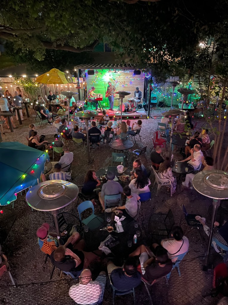 Bacchanal is still far and away, my number one favorite spot in New Orleans and best recommendation for drinks and live music (every day of the week!). Nestled on the corner of a residential area in the Bywater, Bacchanal is the most special place that feels like you’re at a friend’s backyard party. When you walk in, grab a table first, as they fill up quickly. Then have someone in your party hold down the table while someone else goes inside to pick out a bottle of wine for the table. You can purchase cheese and meats and pay a small fee (depends on number of items) to have it plated into a charcuterie board. Additionally, you can order Mediterranean dishes like patatas bravas, olives, confit chicken, and grilled fish, to the table. Once you’ve got everything, pour your wine and sit back and enjoy the show. On this visit, we learned that there is also an upstairs area with a full bar and indoor seating. If you’d rather eat dinner in a more traditional setting, you could eat here and enjoy the music from the balcony.