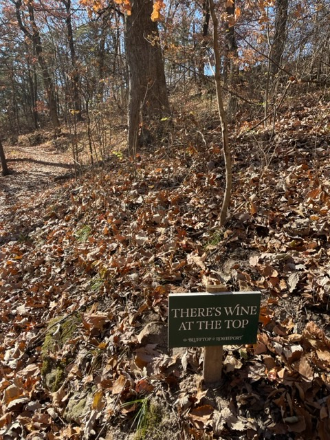 After our hike, we had a glass of wine at the Le Bourgeois A-Frame Winegarden. I loved the encouraging sign on the steep uphill portion of the end of the hike! We were lucky to visit the A-Frame on its final weekend of the fall season. It’s a lovely place to have a picnic and wine with ample seating and a river view. Because it was the last weekend, they didn’t have much left in the way of food, but we tasted a few wines and then bought some snacks to enjoy with our glasses of Missouri wine.