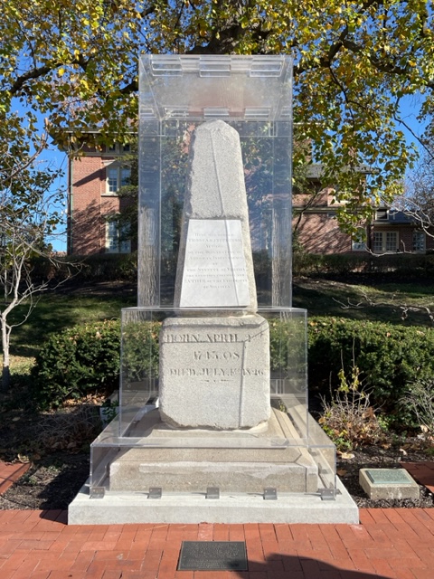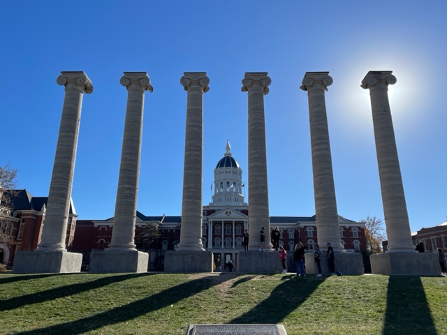 After changing into our gameday attire, we walked around campus to experience a Mizzou gameday. The campus is gorgeous and we enjoyed stopping at some of the iconic spots, such as the Columns and Jefferson’s original gravestone. The Columns on Francis Quadrangle originally supported Mizzou’s first campus building — Academic Hall. They survived a fire and are now one of the most famous locations at the university. Jefferson’s gravestone was donated by his descendants to the University of Missouri in 1883 and bears an epitaph that reads: