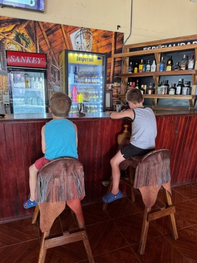 On our way back from the falls, we stopped for lunch at Rancho Lumbi outside of Liberia. We enjoyed the caballero (cowboy) decor, and our fajitas, nachos, and Imperials (the most popular Costa Rican beer).