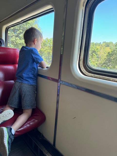 Another day, we took a train ride on the Blue Ridge Scenic Railway. The ride begins at the station in downtown Blue Ridge and travels one hour and 26 miles along the Toccoa River, before arriving at the border towns of McCaysville, GA and Copperhill, TN. The train ride is narrated, although I couldn’t hear most of it due to wrangling my three kids! You can park anywhere in downtown Blue Ridge; we parked in a donation lot at the First Baptist Church nearby. When you purchase tickets, choose between a vintage, climate-controlled car (we chose this due to the heat) or an open-air rail car.