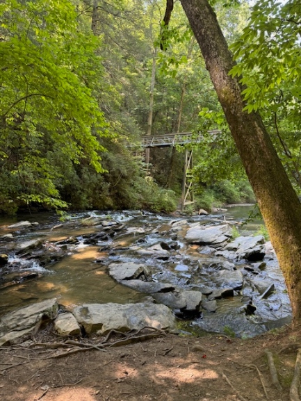Another nature highlight is Amicalola River Falls, the tallest waterfall in Georgia at over 730 feet. We started our trek from the Amicalola Falls State Park visitor center (also the start of an eight-mile hike to Springer Mountain, where the Appalachian Trail begins). We found that the map provided at the visitor center left much to be desired and the person staffing the visitor center had little more information. Since we had all three of our kids and weren’t sure how long the hike would actually be (I still can’t find a definitive answer on this), we decided to drive and park at the reflection pool to shorten the climb to the top of the falls. We climbed 175 steps up to the Lower Observation Platform. We opted not to take the 425 additional steps to the top of the falls, but instead returned to our car. My six-year-old joined me for a hike back (I think we took the Creek Trail, but the signage wasn’t clear). In total, we walked about 1.5 miles.