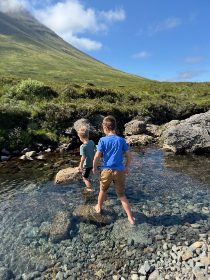 Our first stop in Skye was the Fairy Pools. We arrived mid-morning and had no trouble finding a parking space as the early birds were starting to leave. The trail along the Fairy Pools is great for all abilities because you can take it as long as you like and you’ll see various different pools and falls no matter how far you walk. We walked a round-trip of about 3 miles. Don’t forget swimsuits if anyone wants to take a dip!