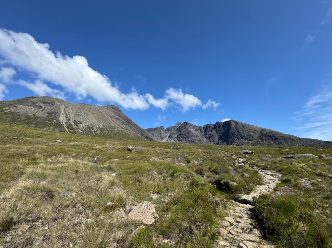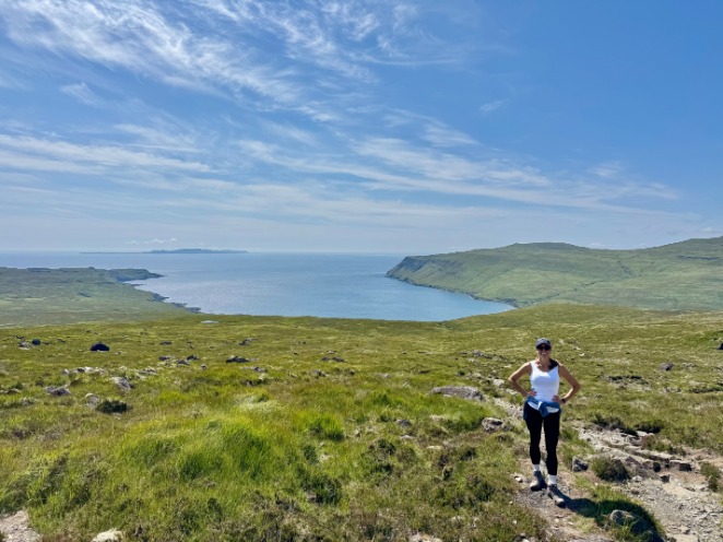 Next, we did the Coire Lagan to the Cuillin Hills viewpoint/Loch for a 3 mile round trip hike. We parked at the Glenbrittle Campsite for our next hike and before setting out, we ate a lunch of pasties, pizza, and smoothies at the Glen Brittle Camp Cafe near the campground. The food is fresh and there is a small shop where you can buy souvenirs or stock up on anything you need for camping/hiking. It’s a popular campsite for good reason as it accesses a mountainside loch as well as the beach. One thing about Scottish hikes is that many of them are a straight climb as they begin at sea level. If we returned, I’d add more stair climbing to my workout regimen to train!