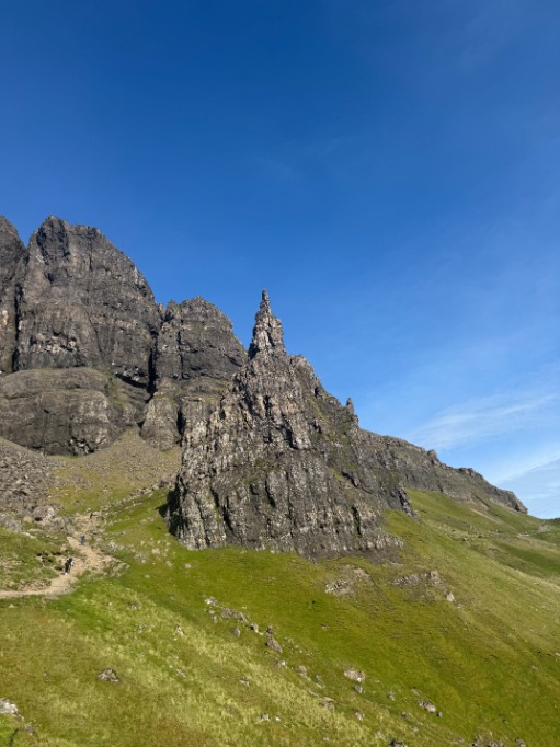 On our second day in Skye, we hiked to the Old Man of Storr, one of the most famous and busiest hikes on the island. We arrived at the Old Man of Storr Car Park at 8:35 am and had no problem finding parking, although the lot was full when we left. We hiked 2.75 miles (again, a straight climb!) to see the famous Old Man of Storr. We took a slightly longer route on the way down to enjoy the views from Trotternish Ridge over the Sound of Raasay.