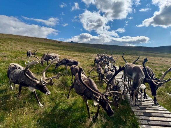 The main reason we were in Aviemore was to visit the Cairngorm Reindeer Herd in Cairngorms National Park. The Cairngorm Reindeer Herd is the only free-ranging herd of reindeer in the United Kingdom. The reindeer were originally introduced from Sweden in 1952, based on the belief that they were native to the area but had died off. Today, there are about 150 reindeer in the free-ranging herd. I had heard about the herd through another blog while researching for the trip and knew that my boys would love the experience. Luckily when we got the flat tire, the staff at the Reindeer Herd were very accommodating and were able to switch us to the last afternoon tour. If you are not able to do a full tour, the Paddock is open to the public and you can view a couple of the reindeer and learn about the herd through educational kiosks. The Glenmore Visitor Center is a short (walkable) distance away if you need a bathroom, snacks, or water bottle refill.