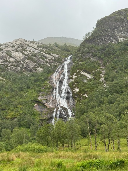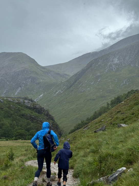 Our first stop in the Fort William area was a hike to Steall Falls (park in the Upper Glen Nevis Car Park). Unfortunately, this was the only few hours of our entire time in Scotland when it rained. We were very blessed with sunny weather for almost the whole trip and hardly needed our rain gear, except for at Steall Falls. Even so, the heavy rain dispersed shortly after we started on the trail. Unfortunately, that meant the midges came out in full force. Admittedly, this wasn’t our top highlight of the trip, but it did result in a funny and lasting memory – in order to reach the falls, you have to cross a river either by rocks or by a rope climb that was too tall for the boys. They took off their shoes and socks to cross the river, but the rocks were slippery and they fell and were soaked. In the time it took to climb out and get their socks and shoes back on, we were all swarmed by a cloud of angry midges. Needless to say, they were not very happy, but we were all able to laugh about it later!