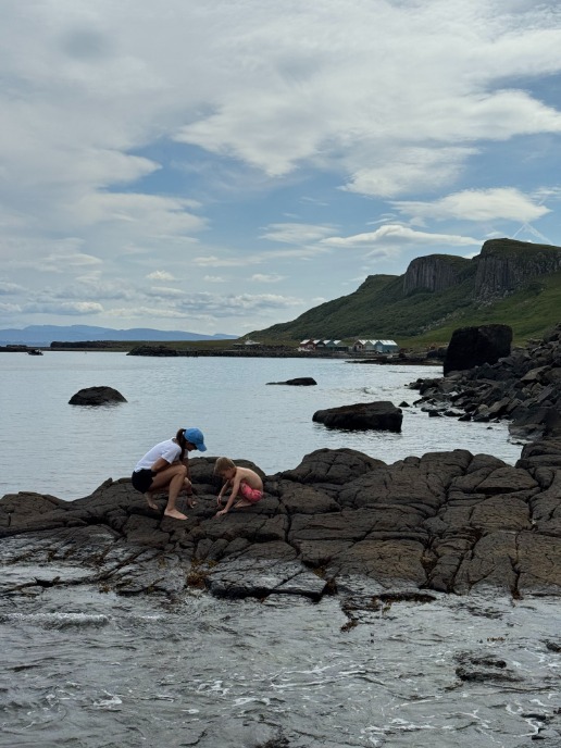 After a quick lunch at a side of the road cafe, we stopped at An Corran/Slipway Beach to swim and look for dinosaur footprints, which I’m thrilled to say we found! It was surreal to put our feet in the spot where a Megalosaurus dinosaur once stood over 60 million years ago. My older son loves to swim no matter the temperature so he braved the cold water while the rest of us enjoyed exploring the rocky shore. Low tide gives you the best chance of finding footprints.