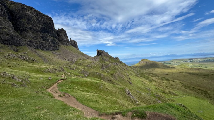 Our final hike before leaving Skye was the Quiraing. This is another area where you can hike as long or short as you like. We ended up walking about 1.75 mi total. We took the middle trail from the car park and did not realize how very narrow and precarious the trail was so we went very slowly with the kids. I reckon I grew several gray hairs trying to keep my boys away from the sheer drops off the side! If you’re with kids, I’d recommend taking the upper trail as it is much wider. Despite the treacherous conditions, we enjoyed incredible scenic views over the landscape.