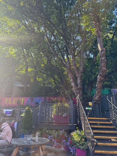 Our day in Edinburgh was beautiful and sunny, and many people were enjoying drinks in the Grassmarket area. We wanted to do the same, but learned that if you have children, you cannot sit in restaurants’ front patios unless the kids order a full meal (this is a great example of random ways things get more complicated when traveling with kids!). Instead, we found a table in the beer garden (behind the restaurant) of the Beehive Inn. As Wimbledon was going on at the time, the atmosphere was fun and celebratory. Alex and I ordered pink gin spritzes like many of the locals and it has since become my cocktail of choice.