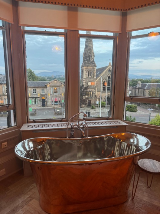 Edinburgh -Once we arrived in Edinburgh, we took a hackney (British taxi) from the train station to the Roseate Edinburgh, a small luxury hotel, where we lucked into staying in the most beautiful suite in the hotel, complete with a copper bathtub. I could have spent a week at this charming and cozy hotel!