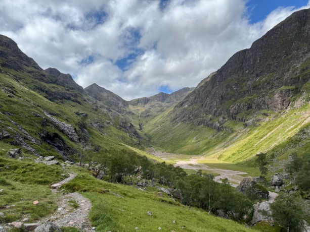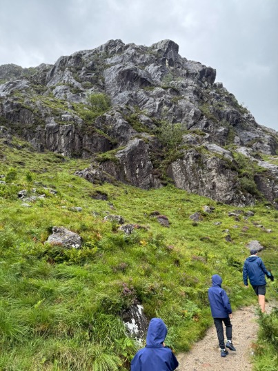 On our second day in the area, we set out for one of my favorite hikes of the trip, Coire Gabhail, or The Lost Valley, (park in the Three Sisters Car Park). The trail gradually, and at some parts steeply, climbs until reaching The Lost Valley. We stopped multiple times to take in the dramatic view of the Three Sisters rising out of the skyline, and enjoyed the view of the valleys while we rested and ate our snacks.