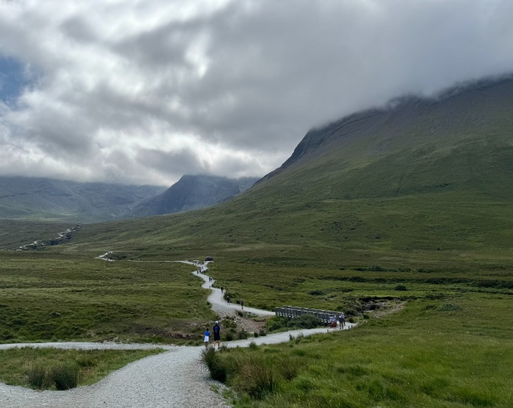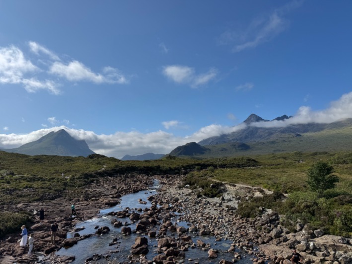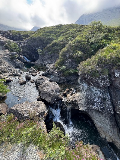 Our first stop in Skye was the Fairy Pools. We arrived mid-morning and had no trouble finding a parking space as the early birds were starting to leave. The trail along the Fairy Pools is great for all abilities because you can take it as long as you like and you’ll see various different pools and falls no matter how far you walk. We walked a round-trip of about 3 miles. Don’t forget swimsuits if anyone wants to take a dip!