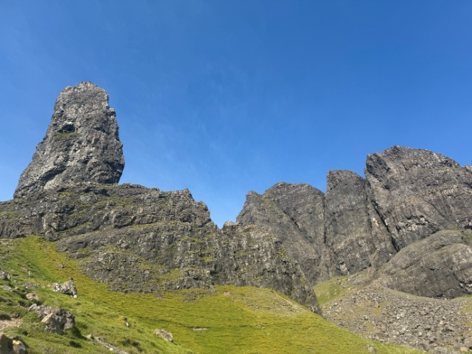 On our second day in Skye, we hiked to the Old Man of Storr, one of the most famous and busiest hikes on the island. We arrived at the Old Man of Storr Car Park at 8:35 am and had no problem finding parking, although the lot was full when we left. We hiked 2.75 miles (again, a straight climb!) to see the famous Old Man of Storr. We took a slightly longer route on the way down to enjoy the views from Trotternish Ridge over the Sound of Raasay.