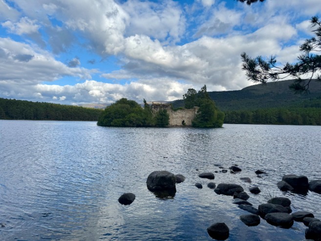 After our reindeer visit, we took a short walk around Loch an Eilen to view the ruins of a small 14th century castle that incredibly, is located in the middle of the loch. Historians think it may have been connected to the shore by a causeway that sunk over time as the water level of the loch rose.