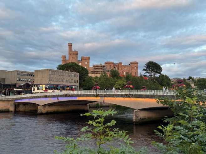 Inverness – Unfortunately, due to our flat tire, our time in Inverness was super short since we arrived late and had to head to the airport early the following morning. All we had time for was a visit to the tartan shop at the Highland House of Fraser (luckily located right next to our hotel, the Premier Inn Inverness Centre River Ness), and a walk around the Ness Bridge and Greig Street Bridge (a passenger bridge). Inverness seemed like a beautiful city from what we saw, and I think if we returned to Scotland, we would use it as a starting point for a road trip around the Highlands.