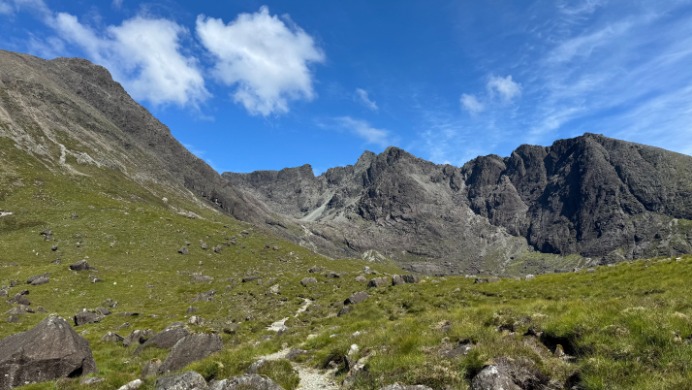 Next, we did the Coire Lagan to the Cuillin Hills viewpoint/Loch for a 3 mile round trip hike. We parked at the Glenbrittle Campsite for our next hike and before setting out, we ate a lunch of pasties, pizza, and smoothies at the Glen Brittle Camp Cafe near the campground. The food is fresh and there is a small shop where you can buy souvenirs or stock up on anything you need for camping/hiking. It’s a popular campsite for good reason as it accesses a mountainside loch as well as the beach. One thing about Scottish hikes is that many of them are a straight climb as they begin at sea level. If we returned, I’d add more stair climbing to my workout regimen to train!